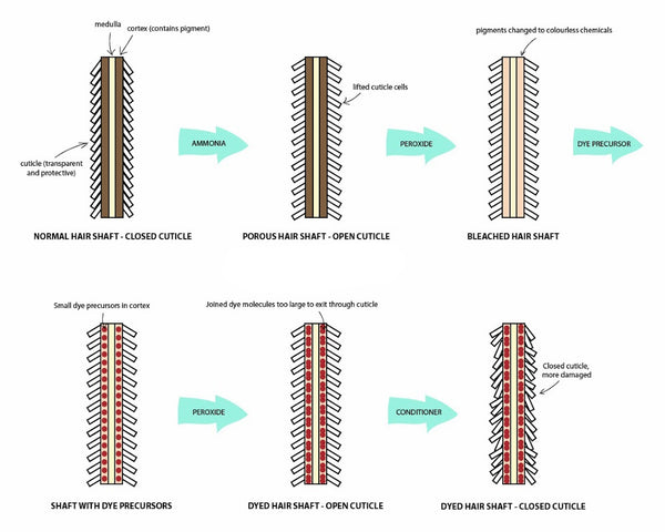 Tout d'abord, l'ammoniac ouvre la cuticule des cheveux, ce qui facilite l'action des autres ingrédients. Le peroxyde d'hydrogène vient ensuite décolorer les cheveux. Finalement, la p-phénylènediamine interagit avec l'ammoniac pour former une nouvelle couleur.